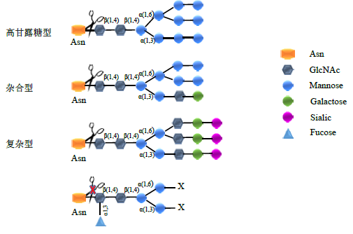 PNGase F酶是一种糖苷内切酶,能特异性切割糖蛋白上的N-糖链。切割的寡糖糖型有:高甘露糖型、杂合型和复杂型;切割位点为:最内侧的N-乙酰葡糖胺和天冬酰胺之间的糖苷键,并释放出完整的寡糖链(见图1)。由于聚糖释放存在偏好性,不完全的去糖基化可能导致结果偏差,无法正确表征样品的N糖基化组成。